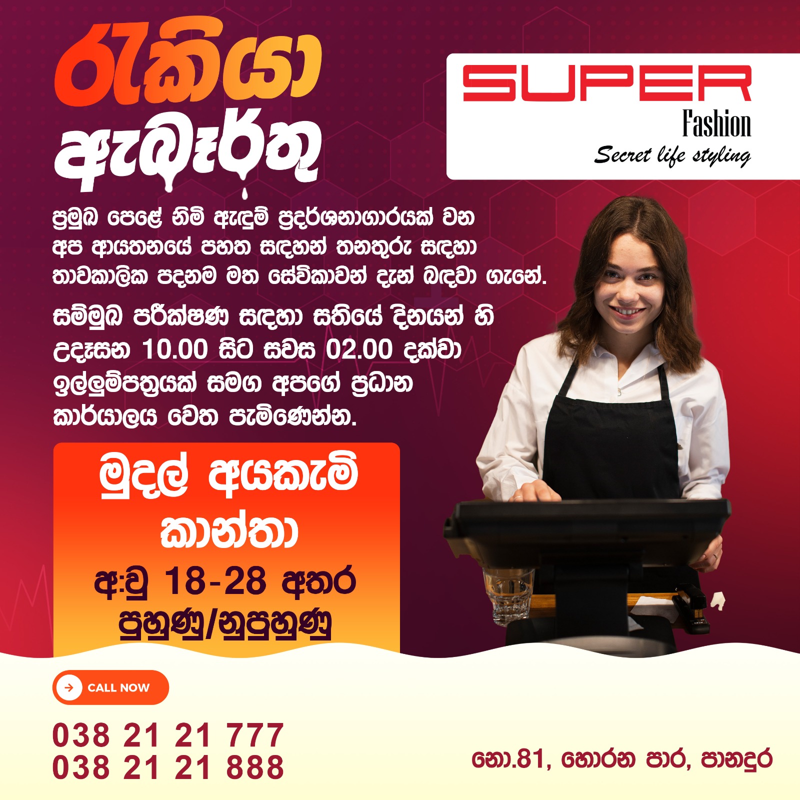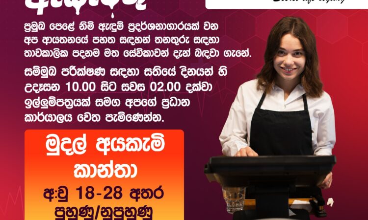 ප්‍රමුඛ පෙලේ නිමි ඇදුම් ප්‍රදර්ශනාගාරයක් වන අප ආයතනයේ පහත සදහන් තනතුර සදහා තාවකාලික පදනම මත සේවිකාවන් දැන් බදවා ගැනේ